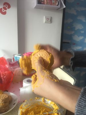 将饼干盖上,用手将多余南瓜馅抹掉
