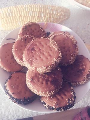 准备小碟滚一圈芝麻,注意南瓜馅的厚度大概两个奥利奥饼干后度