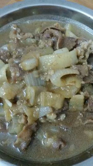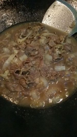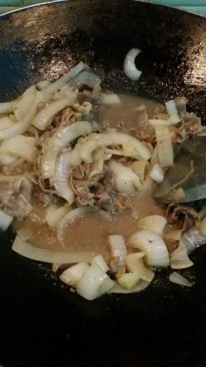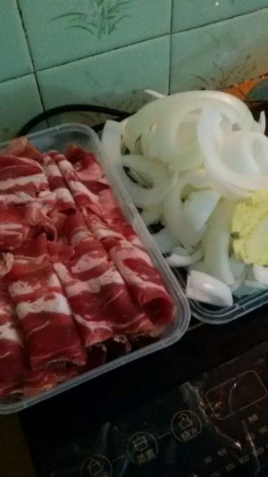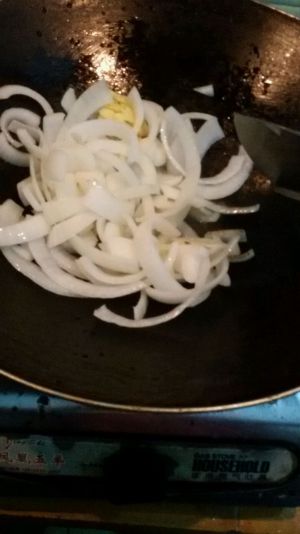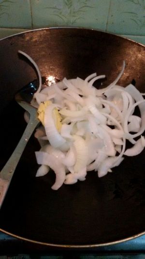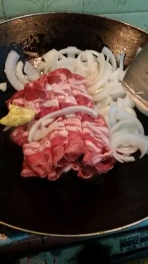 接下来没照照片,我说的仔细点!青菜用清水煮熟,水里放着盐,入味。蔬菜熟了把肥牛飞一下水,没有血色就可以了,时间不要长。热锅,倒入橄榄油,或者菜油都可以,多一点可以。放入洋葱炒软,放一些干虾米提鲜,然后把肥牛放进去炒。炒一下开始调味,放入糖,日式清酒,盐,酱油。干的话放一点水。最后大火收一下汁。