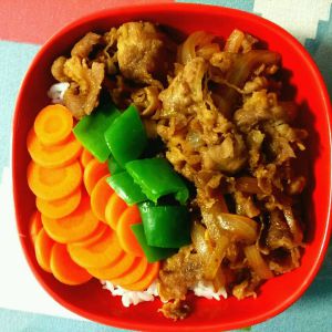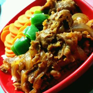 最后把肥牛和青菜胡萝卜放在米饭上,美味的日式吉野家肥牛饭就好了。吉野家是用的菜花和胡萝卜,其实都一样的。