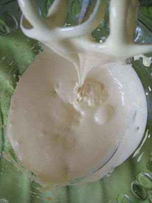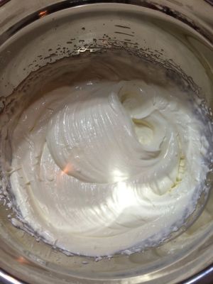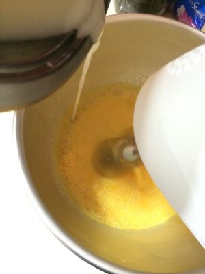 开动打蛋器,慢慢加入煮好的糖水,一直打到冷却,变浓稠
