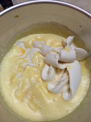 放凉的蛋黄液中加入马斯卡彭奶酪,初步混匀后再用电动打蛋器低档充分混匀