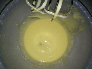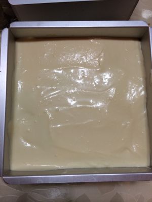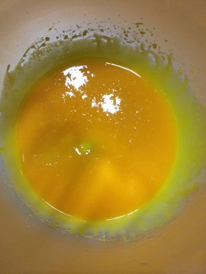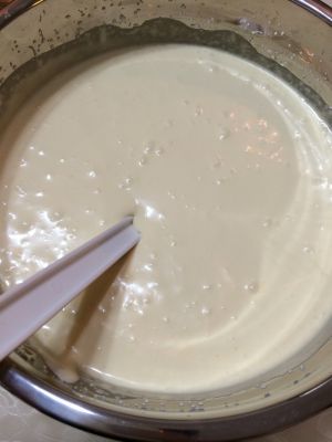 加热好的牛奶液缓慢倒入蛋黄糊中,注意一定要慢,呈细流装倒入,并且要同时搅拌,过快容易变成蛋花汤。最后混好的液体在隔水加热一会,防止蛋黄不熟。放凉待用。