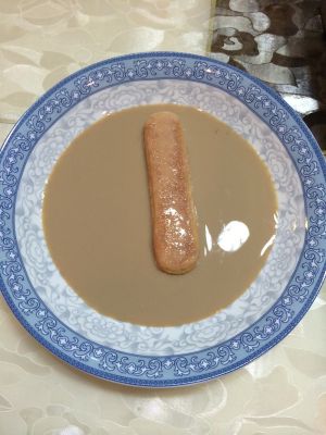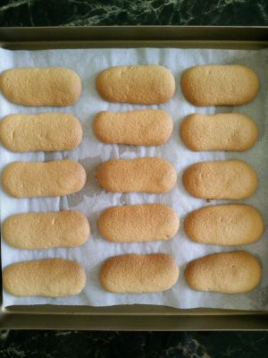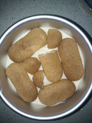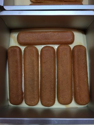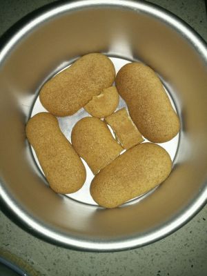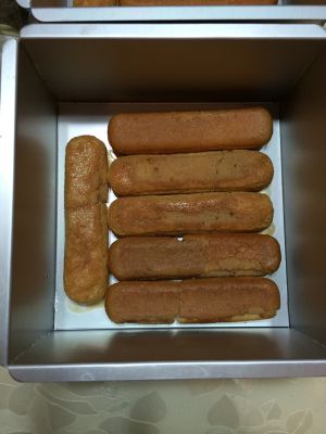 手指饼干,在咖啡蜜里面滚一下,注意不要太湿,也不要太干,鋪入容器底层,倒入混合好的4,至容器大约一半的位置,再铺上一层沾了咖啡蜜的手指饼干。(入没有咖啡蜜,可以用咖啡粉和朗姆酒调配,根据个人口味调配比例)