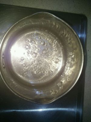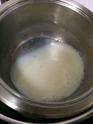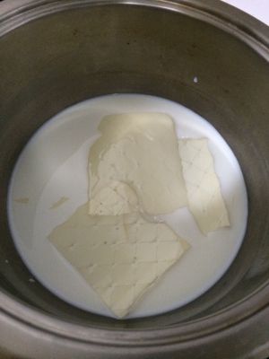 边加热边搅动,注意时间不要过长,吉利丁都融化即可,时间太长牛奶会出块状凝固