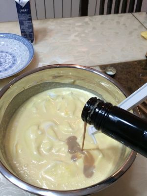 奶酪蛋黄糊倒入淡奶油中,喜欢的话再加入百利甜酒,然后搅拌均匀