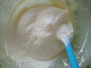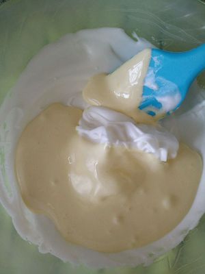 蛋黄糊一次性加入蛋白中,搅拌均匀