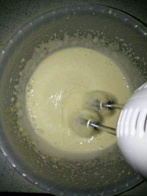 吉利丁隔水融化,开动打蛋器慢慢加入蛋黄糊里