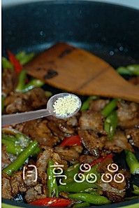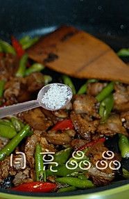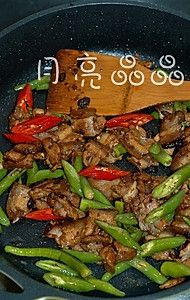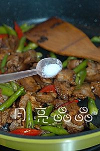 加入辣椒继续翻炒,待辣椒5分熟时加入适当的酱油、蚝油、白糖快速翻炒,出锅前加入适当的醋、盐、鸡精调味,盛出摆盘即可!