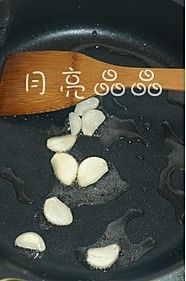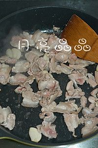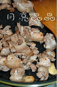 锅烧热,放少许油,下猪肉,中煎出油,待猪肉颜色变金黄时将多余的油沥出后,改大,加入备好的蒜米,放适量料酒翻炒。