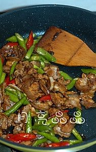 将油小火烧热倒入蒜和姜丝 翻炒冒烟后将肉倒入,翻炒。加入青椒后后加醋。盐。糖 。味精。