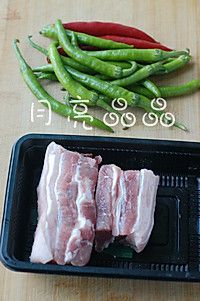 带皮五花肉洗净沥干,提前放冰箱速冻半小时至硬, 取出切成薄片。青红小辣椒切小段,蒜切片。