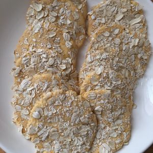 将南瓜取出 捣烂加糯米粉白糖 和成湿面粉团 按压成饼状