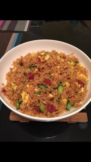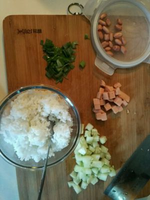 2,锅内放油适量,将花生米炸脆放一旁备用 3,切好的火腿肠,黄瓜丁放油锅里炒熟,加入适量的盐,将冷饭加入一起翻炒,再加酱油适量!香味出来之后把花生米一起加入翻炒,最后放葱花起锅!✌