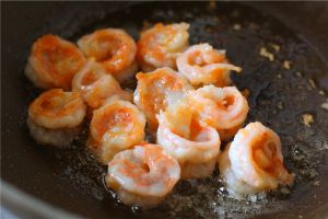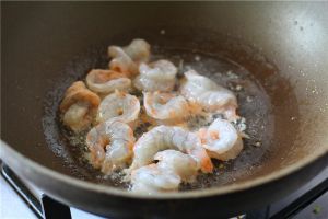放入虾肉滑炒,虾肉放入后不要急着翻动,带稍微变色定型后再翻动,这样不会粘锅
