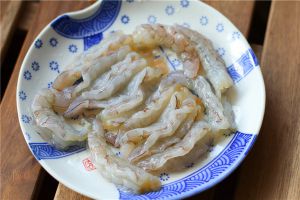 虾肉开背去虾线后,加胡椒粉、黄酒和1克的盐抓拌均匀