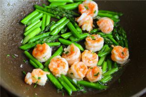 锅里放油,把腌好的虾仁放入煸炒熟,放入绰完水的芦笋,蒜末,小米椒一起翻炒,出锅前放入生抽,盐,花椒油调味即可!