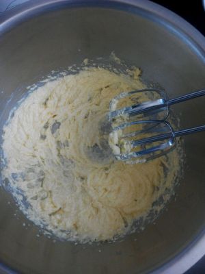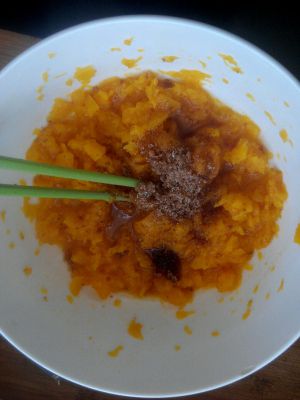 南瓜蒸熟使劲儿搅拌成泥,趁热加入白糖。我这里加的是红糖啦