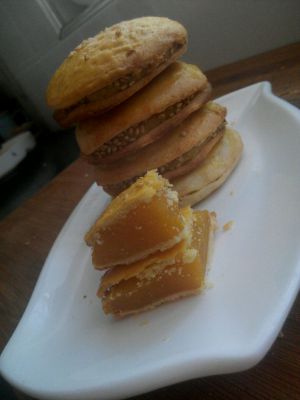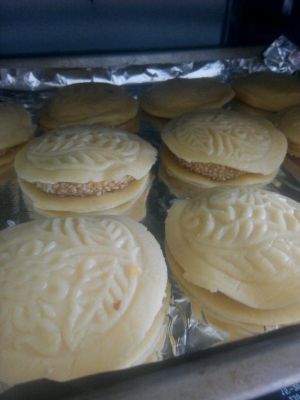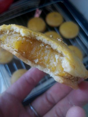 取出拌好南瓜泥。 团成球球儿,裹上白芝麻。 上下两个面片儿夹住裹上白芝麻的南瓜球儿 我这里上面面片儿图案是月饼摸儿印的。 可以不印,因为烤好也看不出来哈。。