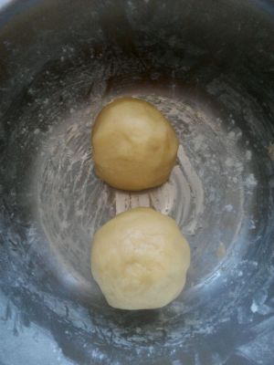搓匀,不沾手,搓一个小圆球,压扁,这步骤忘记拍照片啦