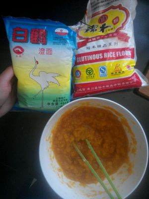 四两南瓜泥中加入一两面粉 三两糯米粉和面 不要加水了 依据自己口味加些糖进去