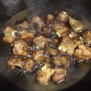 将多余的油倒掉,留底油,倒入调好的酱汁(料酒,酱油,白糖,醋,清水调制而成)。酱汁滚了之后,倒入排骨。