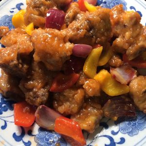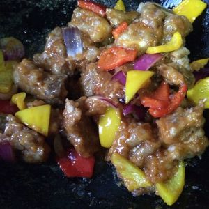 番茄酱加适量糖跟醋还有清水调和备用 油热翻炒一下彩椒 倒入排骨 最后加入调好的酱汁包覆均匀