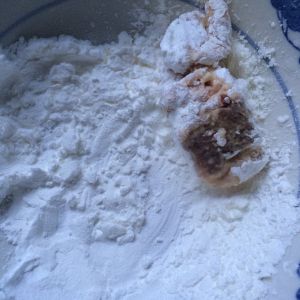炸好的排骨如图,因炸制排骨肉收缩,两侧排骨突出来,肉质成非常漂亮的棕红色。