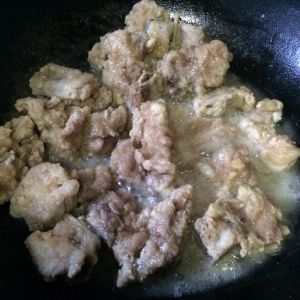 锅里倒入适量油,烧热后倒入排骨炸至色泽微黄;