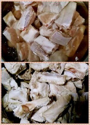 加水,水超过排骨即可,放入陈皮和冰糖,烧开后转中小火,盖上锅盖烧30分钟,最后起锅前,加入盐和香醋少许,等收汁就完成了。