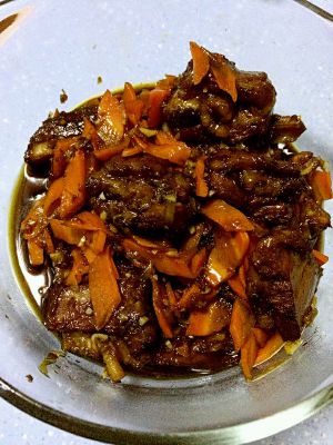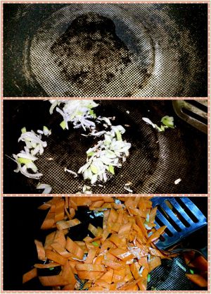 炒锅加少许油,放入葱末煸出香味,倒入胡萝卜片翻炒后加入去骨的排骨肉,翻炒均匀。