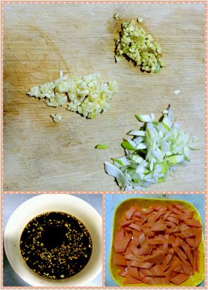 葱、姜、蒜切末,胡萝卜切成小片。取一碗将姜蒜末、白砂糖儿童酱油和柠檬醋放入,再加入少许低钠盐,调匀。