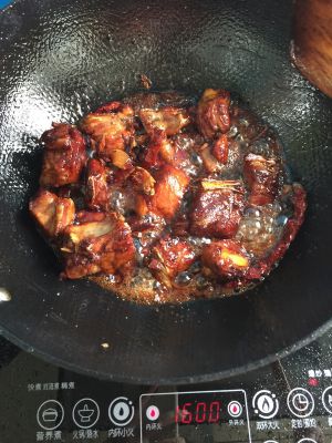 把炸好的排骨捞出,锅内留底油烧热,依次放入炸好的排骨,白糖,水淀粉,加适量温水,大火烧开转中火炖至汤汁浓稠。
