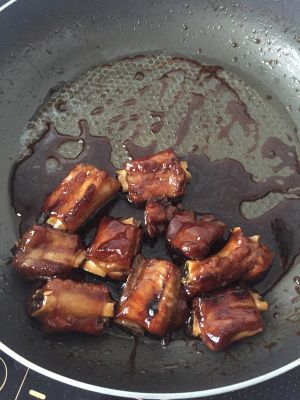 糖熬化成图片色加入备用的排骨,注意下排骨的时候锅里的油可能会炸,下入排骨立即盖锅盖防止烫伤。