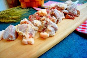 首先,将猪肉切块洗净放姜、盐、料酒、少量生抽搅拌后腌制半小时。