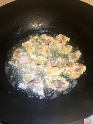 锅中倒入大量油,微热后逐个加入裹好面粉的肉块,小火炸至乳白色出锅。