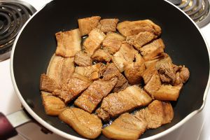 5. 热锅热油,放入煮好沥干的五花肉,把猪皮的一面煎成金黄