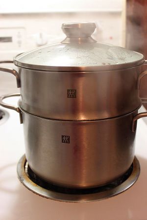 将半成品的梅菜扣肉放入蒸锅中蒸一个小时然后取出