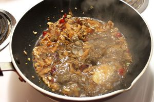 用煎肉的油爆香葱姜蒜辣椒末,加入梅干菜翻炒,加入少量清水,生抽,盐,冰糖,还有刚刚腌肉剩下的老抽和蜂蜜以及煮肉剩下的八角和桂皮