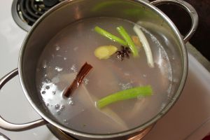 清水中加葱,姜,八角,桂皮,将五花肉煮熟后捞出,八角和桂皮同样捞出备用