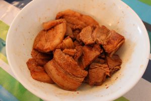 待五花肉凉凉,切片,用酱油、料酒、腐乳汁、蜂蜜腌制一个小时左右