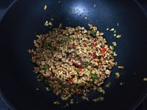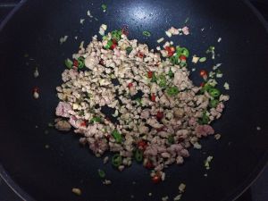 锅内倒油.放青红线椒.葱蒜末爆香(葱花留一些)