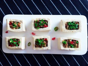 将调好的蚝油汁淋在蒸好的酿豆腐上,撒上切碎的小葱末即可食用。