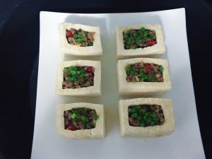 肉末300克,鸡蛋半个,生抽1/2汤匙,淀粉1茶匙,蒜末少许和少许掏出来的北豆腐一起搅拌均匀,用勺子将调好的肉末装入掏空的豆腐里。