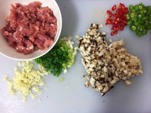 将所有蔬菜洗净.青红线椒切碎.香菇切碎.葱蒜切碎备用(猪肉馅是买的现成的)