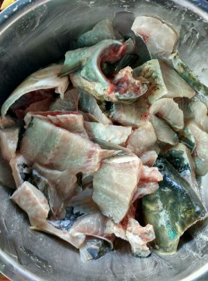 鱼肉切蝴蝶片,就是一刀不割断鱼皮的切,再一刀切开,摊开就成蝴蝶片,鱼头骨头那些洗净血水待用,最好用料酒腌制一会去腥再用清水过滤