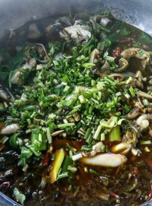 鱼肉一片片摊开放入高汤里,大火一分钟就好了,不要搅拌,以免鱼肉煮散开,最后一锅倒入骨头和酸菜盆里