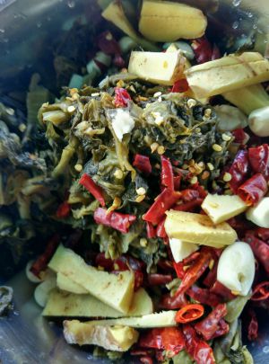 准备各种配料(干辣椒,花椒,泡椒切碎,姜片,大葱)