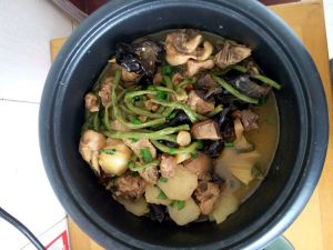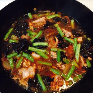 锅里放少量油,一勺糖炒糖色,加肉翻炒,加少量水,放入葱蒜,大火15分钟后,加入香菇木耳,豆角土豆,小火闷至土豆熟透 出锅前加入少量葱花提香即可