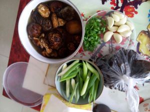 木耳香菇泡发,葱切段,姜切片,蒜拨皮